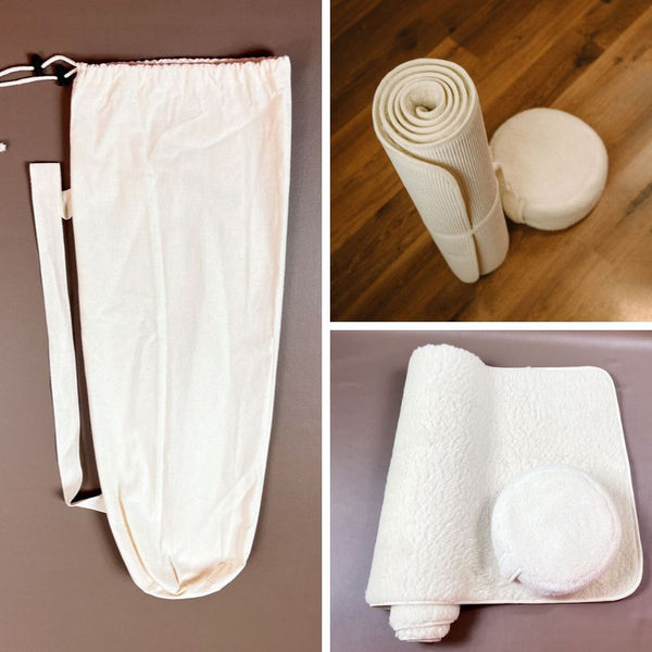 Le pack est composé du tapis de yoga en laine Dhodra (avec ou pas son large sac de transport en coton) et du coussin rond de méditation Laira. Ils sont tous désignés et fabriqués en Europe du Nord